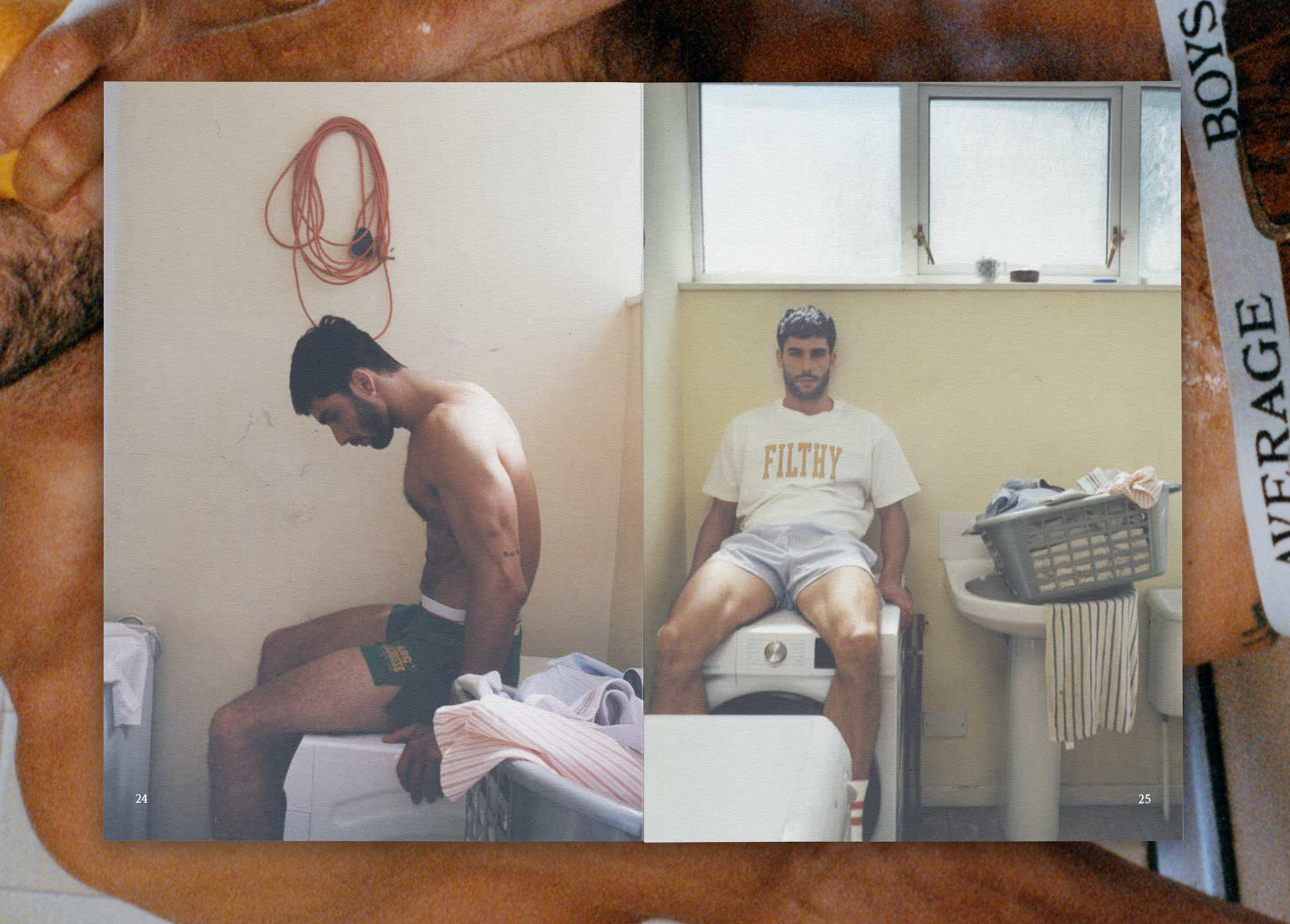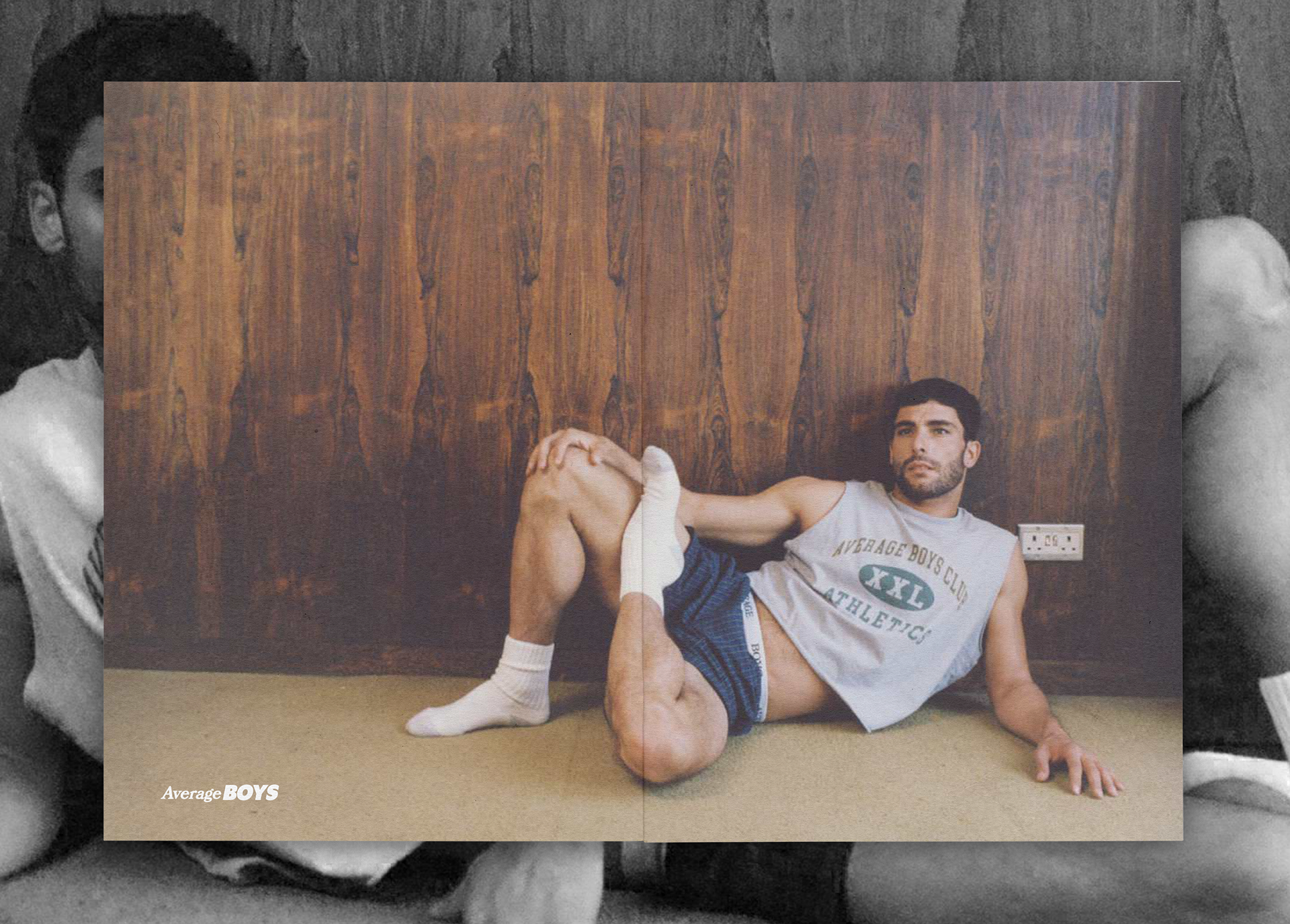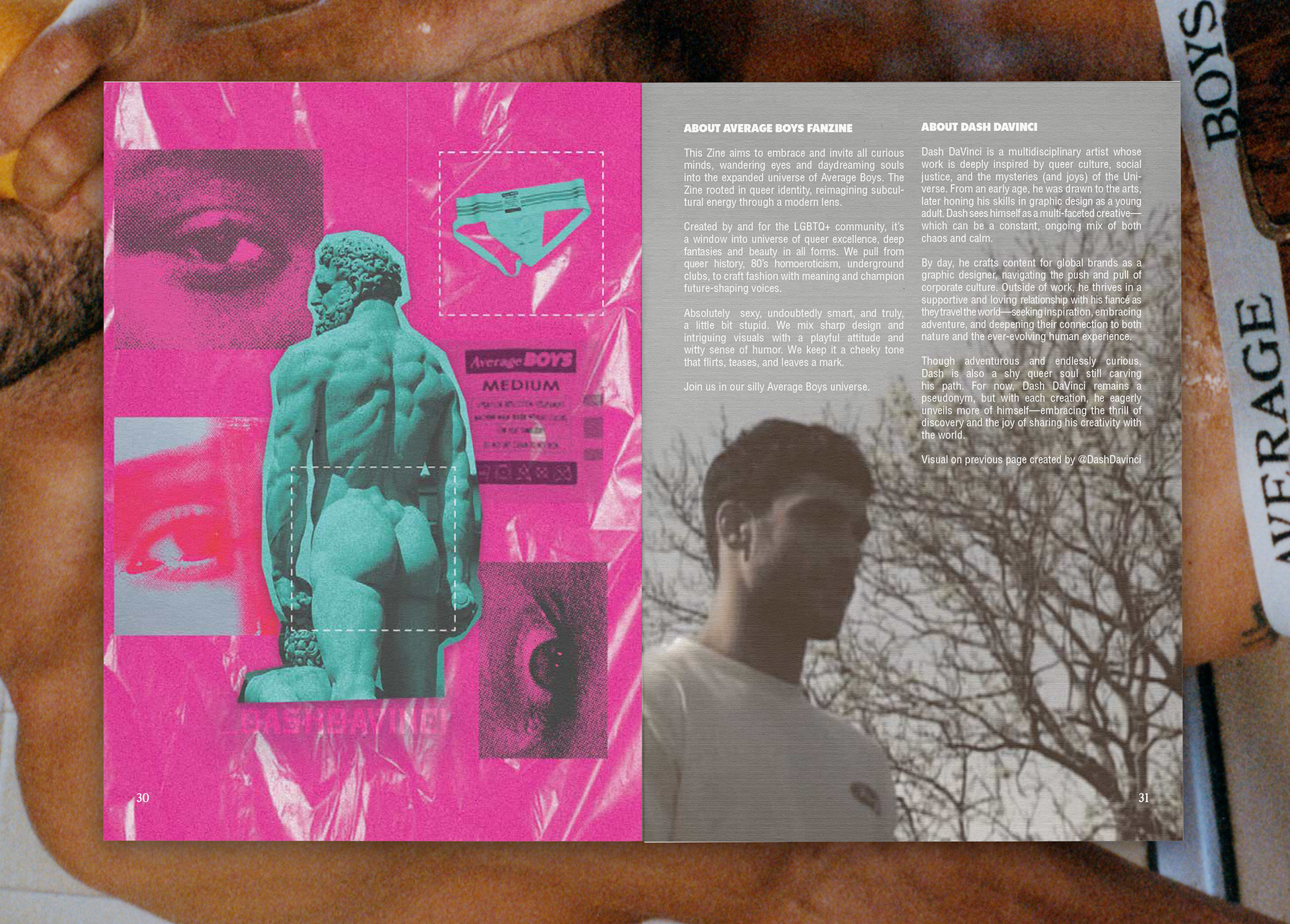 This Zine aims to embrace and invite all curious minds, wandering eyes and daydreaming souls into the expanded universe of Average Boys. The Zine rooted in queer identity, reimagining subcul-tural energy through a modern lens.