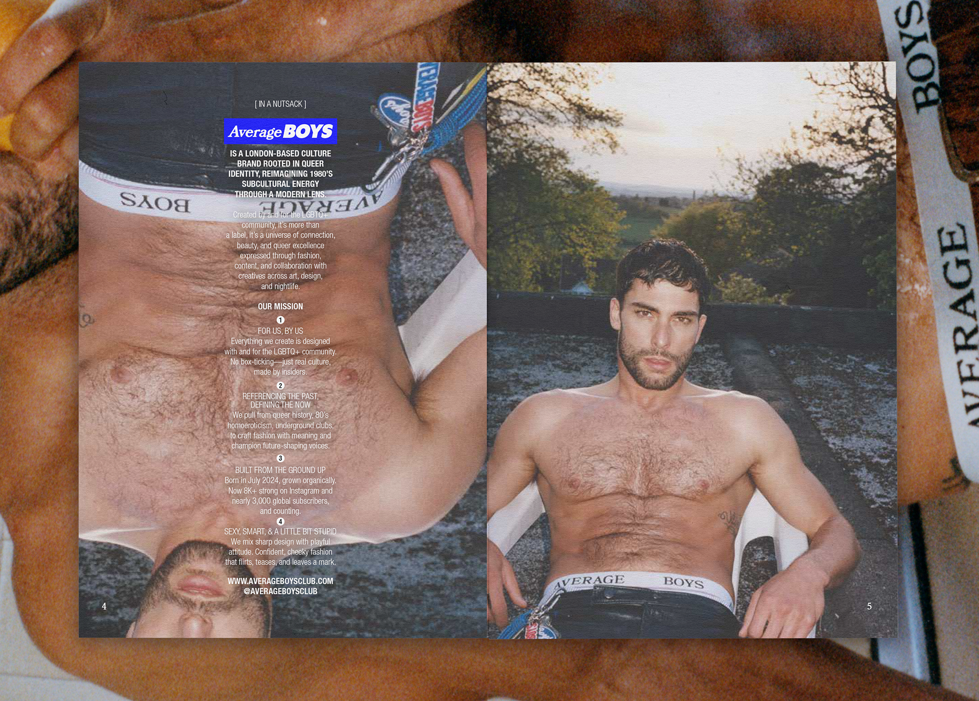 Average Boys is a London-based, community driven brand celebrating gay culture in all its bold, messy, and beautiful forms. Inspired by the 80s when queer lives were anything but average we honour the codes, aesthetics, and homoerotic energy of our history while creating something modern, joyful, and relevant for today.