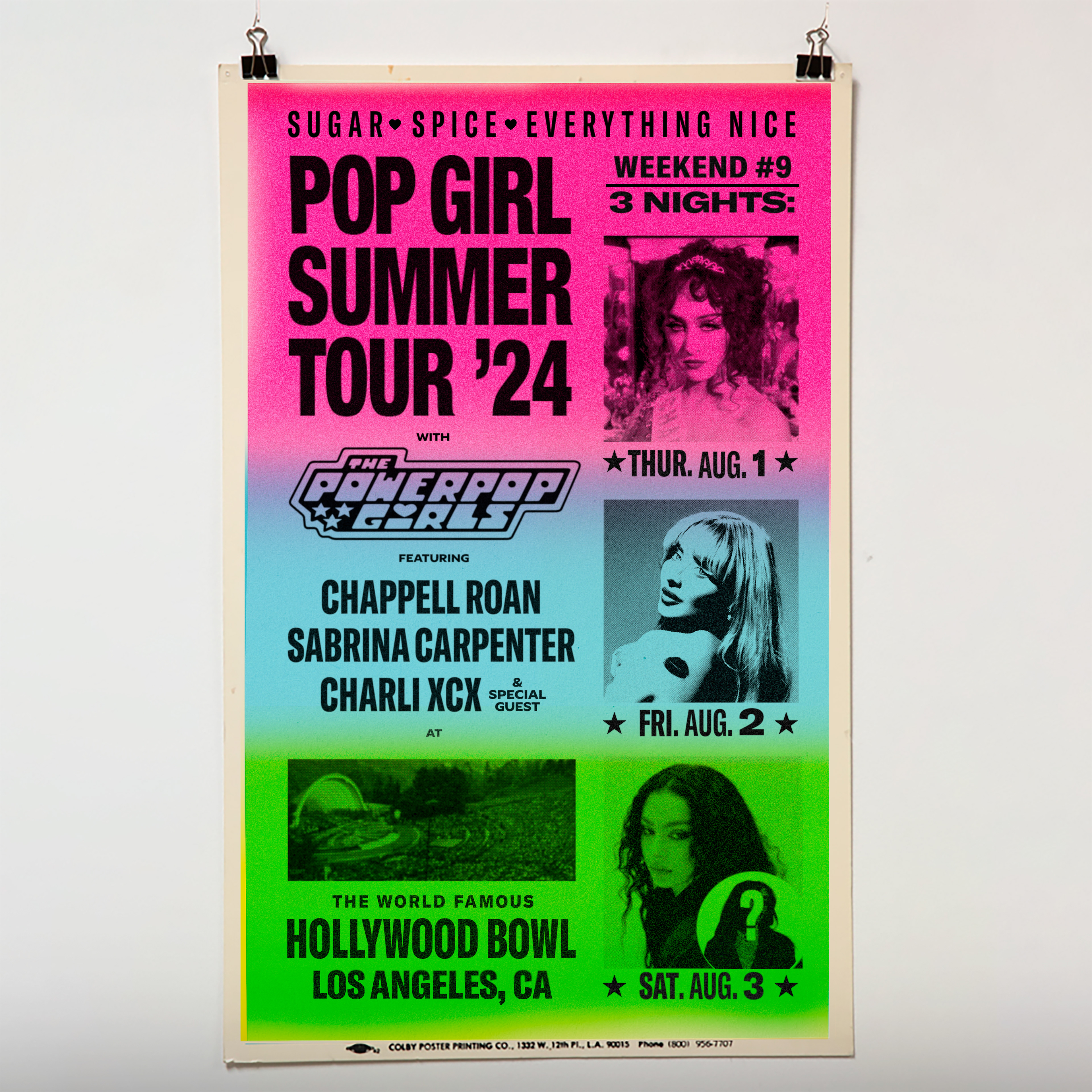 Concert tour poster art for "The PowerPop Girls" inspired by the music talents behind "Pop Girl Summer" of 2024. Note: This is not a real event. The poster references music artists Chappel Roan, Sabrina Carpenter, Charli XCX and Billie Eilish. There are also references and parallels to The PowerPuff Girls, the hit animated television series that ran from 1998-2005.