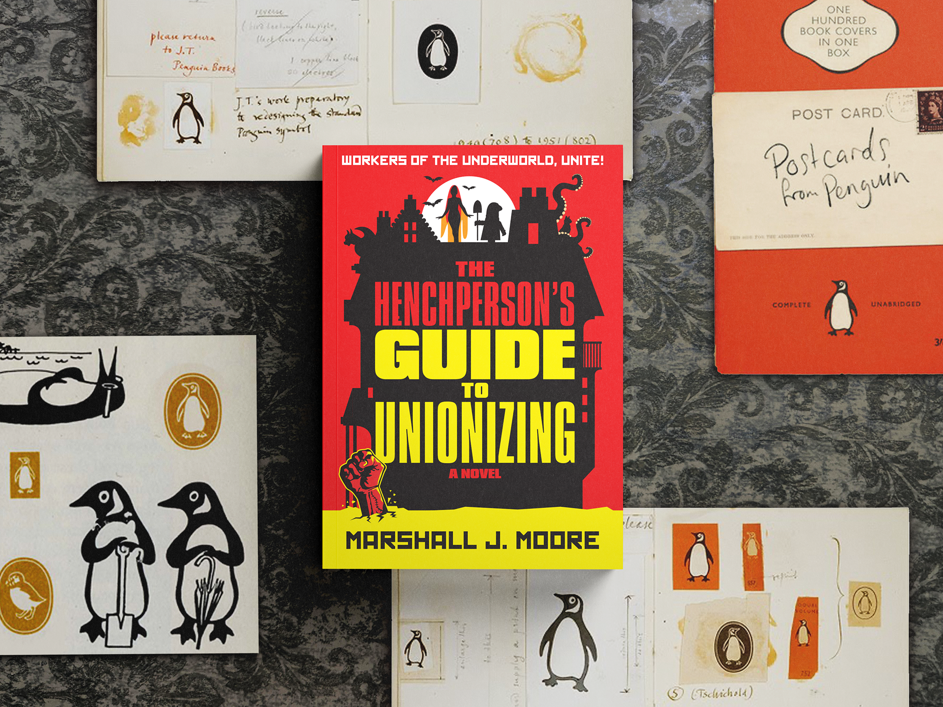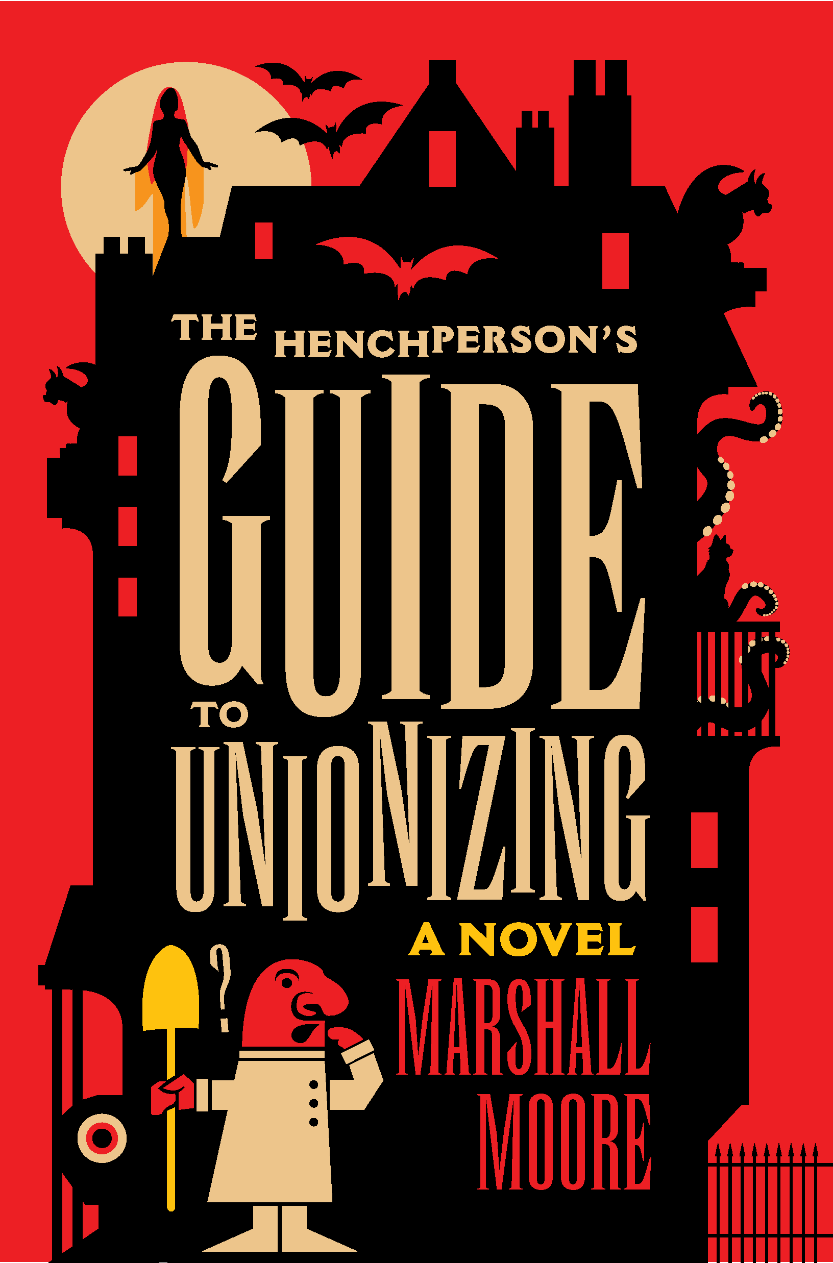 Book cover art for The Henchperson's Guide to Unionizing, a novel by Marshall J. Moore. Published in 2026 by Bantam Books an imprint of Ballantine Books publishing group, part of Penguin Random House. This limited first edition paperback of The Henchperson’s Guide to Unionizing features stenciled edges depicting a character from the book.