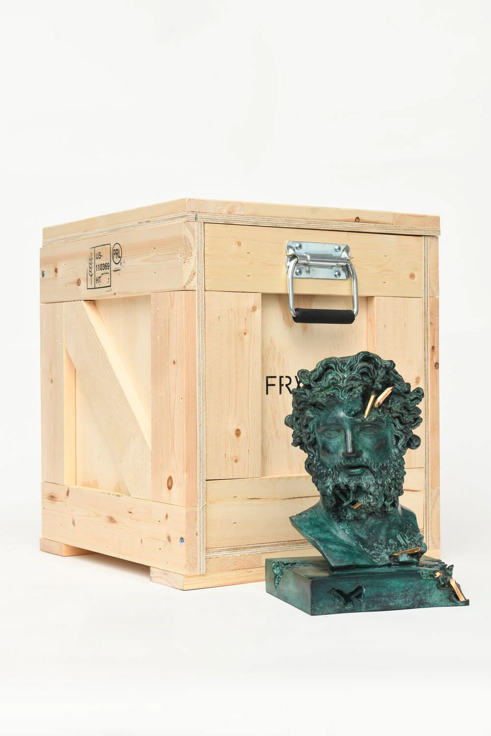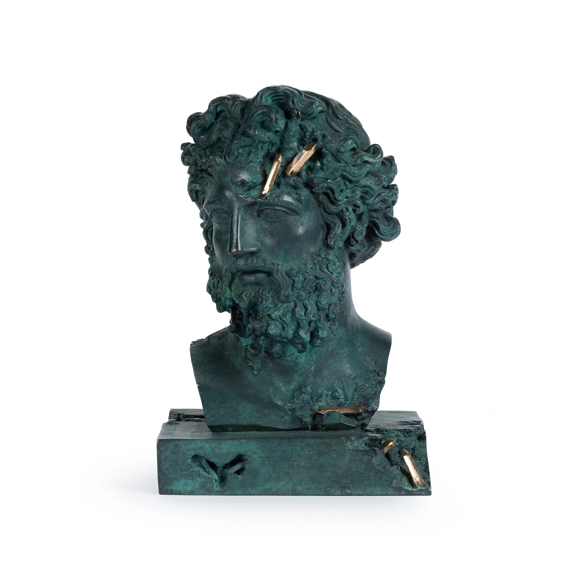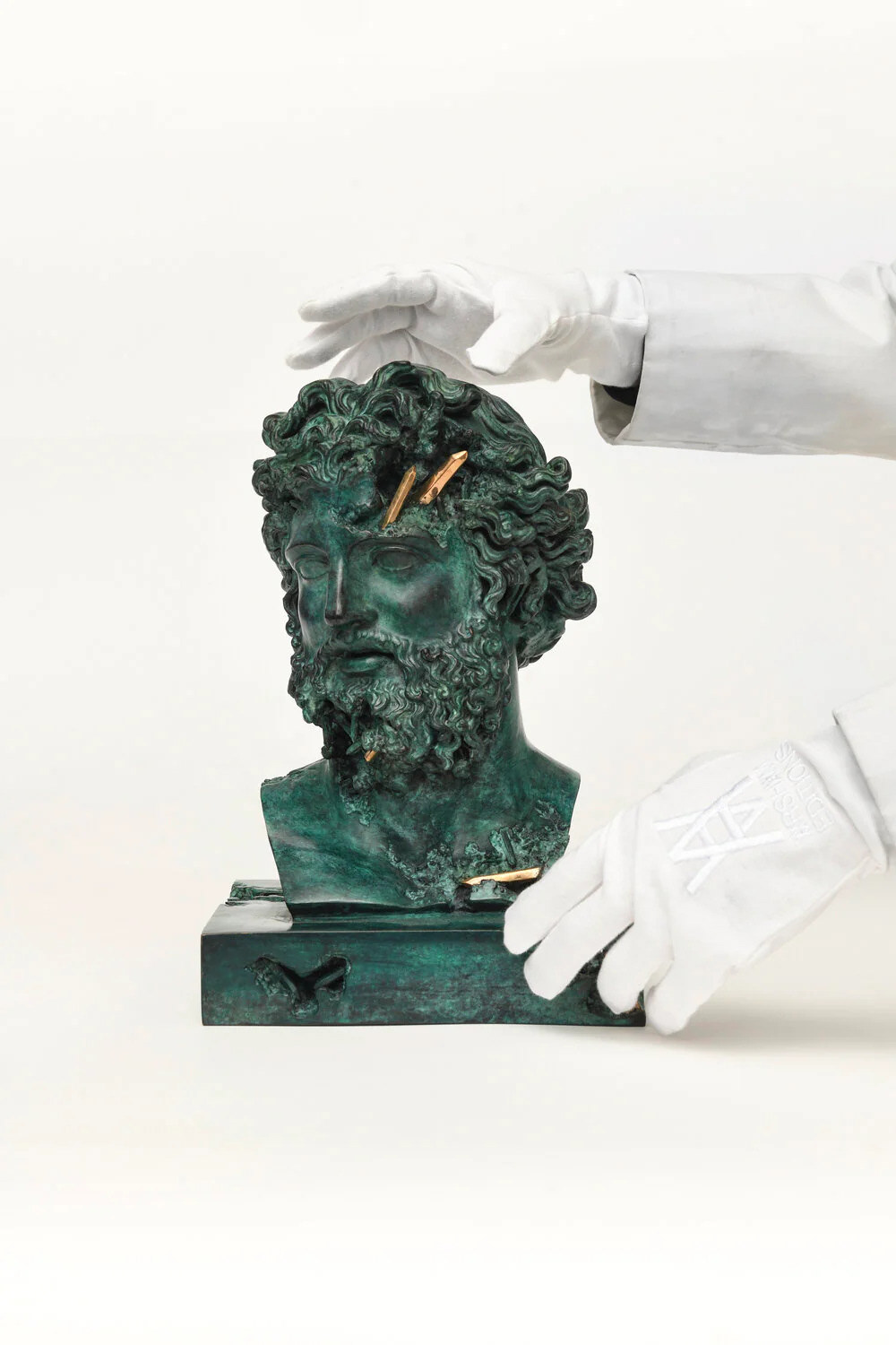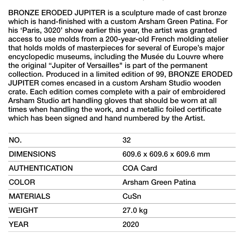 Official Art Piece Description: BRONZE ERODED JUPITER is a sculpture made of cast bronze which is hand-finished with a custom Arsham Green Patina. For his ‘Paris, 3020’ show earlier this year, the artist was granted access to use molds from a 200-year-old French molding atelier that holds molds of masterpieces for several of Europe’s major encyclopedic museums, including the Musée du Louvre where the original “Jupiter of Versailles" is part of the permanent collection. Produced in a limited edition of 99, BRONZE ERODED JUPITER comes encased in a custom Arsham Studio wooden crate. Each edition comes complete with a pair of embroidered Arsham Studio art handling gloves that should be worn at all times when handling the work, and a metallic foiled certificate which has been signed and hand numbered by the Artist.